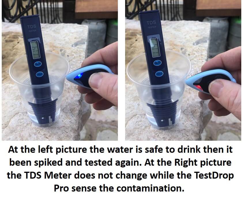 The main advantage of the TestDrop Pro vs TDS meters is that TDS meters do not test for contamination while the TestDrop Pro only tests for dangerous contaminants (and does not test for good minerals).